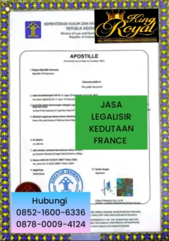 Kingroyal Adalah satu-satunya biro jasa Legalisir Kedutaan Francis yang terpercaya dan Berpengalaman,Kami Akan siap membantu anda Karna rumitnya Dan waktu yang lama mengurus Legalisir di keduraan, Sekarang anda tidak perlu berkecil hati Atau pun pusing, serahkan segala pengurusan legalisir kepada kami, kami akan membantu anda Untuk legalisir dokumen yang anda perlukan, diantaranya Menerjemahan Dokumen dengan penerjemah tersumpah, Legalisir kementerian hukum dan ham, Kementerian Luar negeri, Kementerian Agama, Notaris, dikti dan Kedutaan mana pun yang anda perlukan.