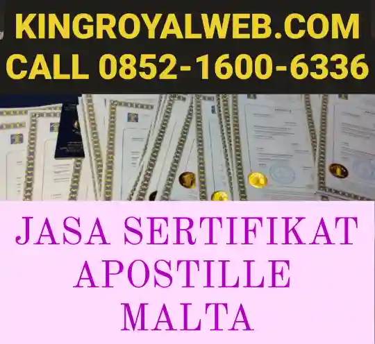 Kingroyal Adalah satu-satunya biro jasa Sertifikat Apostille Malta di kemenkumham,yang terpercaya dan Berpengalaman,Kami Akan siap membantu anda Karna rumitnya Dan waktu yang lama mengurus Apostille, Sekarang anda tidak perlu berkecil hati Atau pun pusing, serahkan segala pengurusan legalisir kepada kami, kami akan membantu anda Untuk legalisir dokumen yang anda perlukan, diantaranya Menerjemahan Dokumen dengan penerjemah tersumpah, Legalisir kementerian hukum dan ham, Kementerian Luar negeri, Kementerian Agama, Notaris, dikti dan Kedutaan mana pun yang anda perlukan.