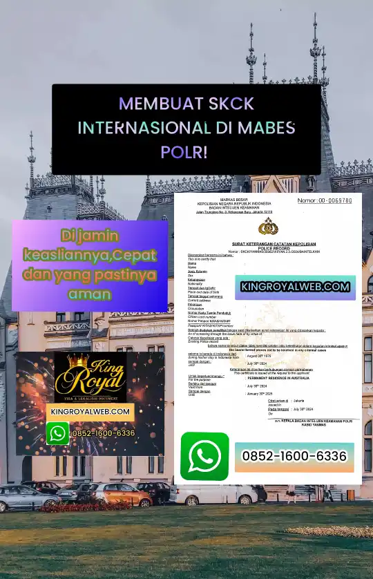 Kingroyal Adalah biro jasa membuat skck internasional di mabes polri Online dan offline ,tidak perlu anda ragukan lagi ,jika anda ingin kerja,sekolah ataupun izin tinggal,jawabannya pasti skck mabes polri dan anda harus datang kemabes polri untuk pembuatan skck nya.jika anda memang sibuk atau jauh dari mabes polri,kami siap membantu anda dalam mengurus skcknya,Adapun persyaratan yang harus anda kirim ke kami tertera di bawah ini sebagai berikut ;