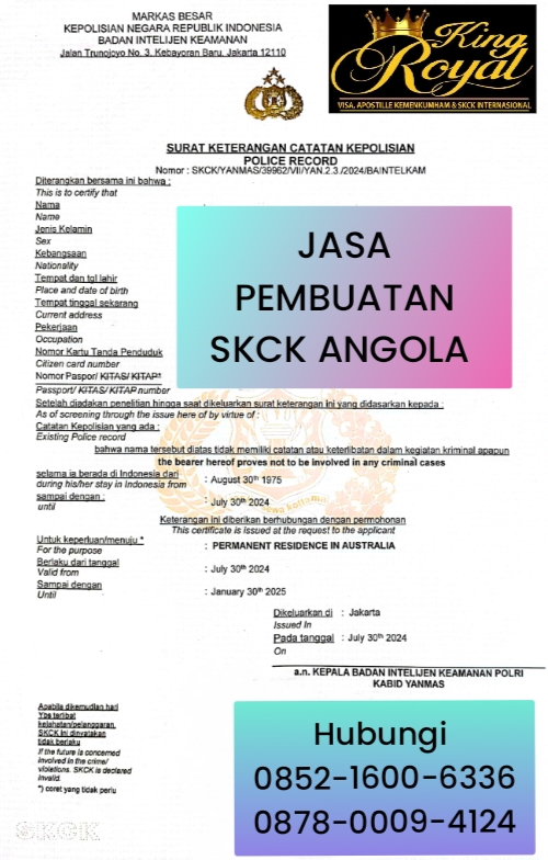 Kingroyal Adalah biro jasa Pembuatan skck Tujuan Angola di Mabes Polri, profesional dan Sangat Berpengalaman,Kami pun Melayani Jasa Menerjemahkan dokumen dengan Penerjemah tersumpah,Legalisir di Kementerian Agama, Kementerian Hukum dan Ham, Kementerian Luar Negeri,dikti dan Semua kedutaan yang berada di indonesia,Jika anda ingin melegalisir Dokumen di Kedutaan untuk keperluan Mengurus Visa,Ingin Kerja,Izin Tinggal atau Ingin Menikah,Kami siap membatu segala kesulitan yang anda alami.