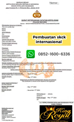 Kingroyal biro jasa skck luar negeri | skck mabes polri,jika anda ingin membuat visa atau urusan luar negeri jawabannya pasti hanya skck mabes polri,skck mabes polri adalah skck yang di peruntukan untuk keperluan luar negeri dan untuk keperluan pembuatan skck Capres dan Caleg.bagi anda yang masih bingung atau tidak ada waktu untuk membuat skck kami siap membantu anda,Anda tidak perlu repot datang ke mabes polri cukup dengan menghubungi kami dan mengirim soft copy dokumen yang di perukan. Kami pun Melayani Jasa Menerjemahkan dokumen dengan Penerjemah tersumpah,Legalisir di Kementerian Agama, Kementerian Hukum dan Ham, Kementerian Luar Negeri,Apostille dokumen ,dikti dan legalisir di kedutaan.
